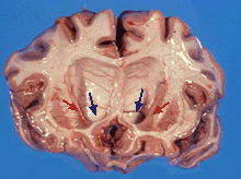 | Medium spiny neurons (yellow) with nuclear inclusions, which occur as part of the disease process, stained orange | |