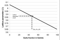 InGaAs has a lattice parameter that increases linearly with the concentration of InAs in the alloy.[7] The liquid-solid phase diagram[3] shows that during solidification from a solution containing GaAs and InAs, GaAs is taken up at a much higher rate than InAs, depleting the solution of GaAs. During growth from solution, the composition of first material to solidify is rich in GaAs while the last material to solidify is richer in InAs. This feature has been exploited to produce ingots of InGaAs with graded composition along the length of the ingot. However, the strain introduced by the changing lattice constant causes the ingot to be polycrystalline and limits the characterization to a few parameters, such as bandgap and lattice constant with uncertainty due to the continuous compositional grading in these samples.