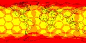 تغطية كوكب الأرض بواسطة سواتل إيريديوم، التي يتم ترتيبها في 6 مدارات لكل منها 11ساتل. تظهر الرسوم المتحركة حوالي 10 دقائق.