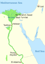 Ka ruled over Thinis in the first half of the 32nd century BC and was buried at Umm el-Qa'ab. He most likely was the immediate successor to Iry-Hor and was succeeded either by Narmer or by Scorpion II. He is the earliest known Egyptian king with a serekh inscribed on a number of artifacts. This may thus be an innovation of his reign.[11] Ka is one of the best attested predynastic kings with Narmer and Scorpion II. Beyond Abydos, he is attested in the predynastic necropolis of Adaima in Upper Egypt[12] and in the north in Tarkhan, Helwan, Tell Ibrahim Awad, Tell el-Farkha (Eastern Nile Delta), Wadi Tumilat and as far north as Tel Lod in the Southern Levant.[13]