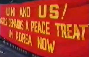 تمتد المنطقة منزوعة السلام شمال شرق خط العرض 38؛ إلى الجنوب، متجهة غرباً. العاصمة الكورية القديمة كايسونگ، مكان عقد مفاوضات الهدنة، كانت في كوريا الجنوبية قبل وقوع الحرب، لكنها حالياً جزءاً من كوريا الشمالية. قيادة الأمم المتحدة، بدعم من الولايات المتحدة، وقع الجيش الشعبي الكوري الشمالي، والمتطوعين الشعبيين الصينيين، على اتفاقية الهدنة في 27 يوليو 1953 لإنهاء القتال. كما دعت الهدنة حكومات كوريا الجنوبية وكوريا الشمالية والصين والولايات المتحدة للمشاركة في محادثات السلام المستمرة. أعتبر أن الحرب قد انتهت عند هذه المرحلة، على الرغم من عدم وجود معاهدة سلام.[22] ومع ذلك، تدعي كوريا الشمالية بأنها قد فازت في الحرب الكورية.[23][24]