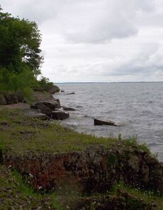 Both the Erie and Neutrals were colonized and assimilated by their hostile eastern neighbors, the Iroquois Confederacy, between 1651 and 1657 during the Beaver Wars.[27] For decades after those wars, the land around eastern Lake Erie was claimed and utilized by the Iroquois as a hunting ground. As the power of the Iroquois waned during the last quarter of the 17th century, several other, mainly Anishinaabe, displaced them from the territories they claimed on the north shore of the lake.[28] There was a legend of an Indigenous woman named Huldah, who, despairing over her lost British lover, hurled herself from a high rock from Pelee Island.[14]