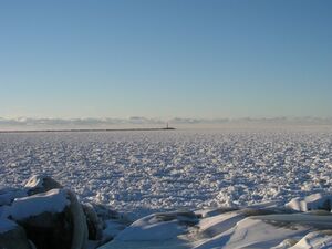 The effects of the warmer lake water is reduced when the lake freezes over.[57] In January 2011, for example, residents of Cleveland were glad when Lake Erie was "90 percent frozen" since it meant that the area had "made it over the hump" in terms of enduring repeated snowfalls which required much shoveling.[58] Being the shallowest of the Great Lakes, it is the most likely to freeze and frequently does.[59] In contrast, Lake Michigan has never completely frozen over since the warmer and deeper portion is in the south, although it came close to being totally frozen during three harsh winters over the past century.[60] In past years, lake ice was so thick that it was possible to drive over it or go sailing on iceboats.[44] Many lake residents take advantage of the ice and travel; some drive to Canada and back:[61]