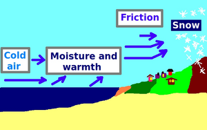 As cold air flows over the warm water, the lake warms and moistens the air. Since warm, moist air is less dense than cold air, the heated air rises. Rising air cools and water vapor condenses into cloud droplets ... the efficiency of snow production increases when the wind pushes the clouds over land. Friction with the ground causes air to pile up. This frictional convergence creates lift and enhances snowfall.