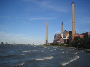 Strong winds have caused lake currents to shift sediment on the bottom, leading to shifting sandbars that have been the cause of shipwrecks.[44] But winds can have a peaceful purpose as well; there have been proposals to place electricity–producing wind turbines in windy and shallow points in the lake and along the coast. Steel Winds, a former steel mill site in Buffalo, has been developed as an urban wind farm housing 14 turbines capable of generating up to 35 megawatts of electricity.[62] A plan by Samsung to build an offshore wind farm on the north shore of the lake, from Port Maitland to Nanticoke for a distance of 15.5 mi (24.9 km),[63] has been met with opposition from residents. Canadians near Leamington and Kingsville have organized protest groups to thwart attempts to bring wind turbines to the lake; reasons against the turbines include spoiling lake views.[64] Plans to install turbines in Pigeon Bay, south of Leamington were met with opposition as well.[65][66] The notion that bird and bat migration may be hurt by the wind turbines has been used to argue against the wind turbines as well.