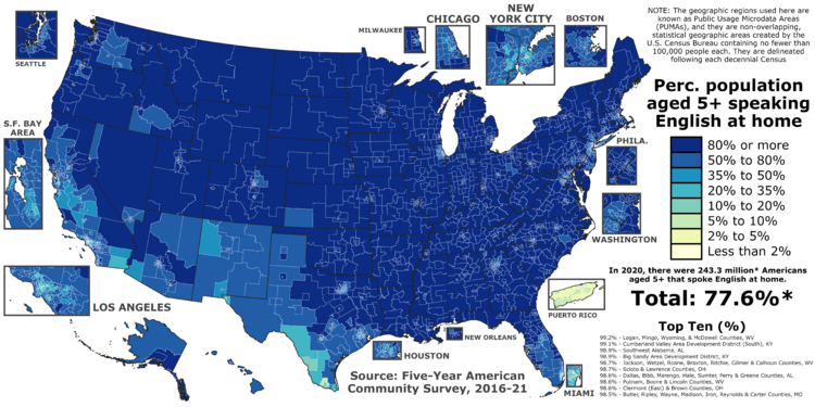 غالبية المتحدثين باللغات الأجنبية في الولايات المتحدة هم ثنائيو اللغة أو متعددو اللغات، ويتحدثون الإنگليزية عادة. على الرغم من أن 21.5% من المقيمين في الولايات المتحدة أفادوا أنهم يتحدثون لغة أخرى غير الإنگليزية في المنزل، إلا أن 8.2% فقط يتحدثون الإنگليزية بشكل أقل من "جيد جدًا".[7] Approximately 430 languages are spoken or signed by the population, of which 177 are indigenous to the U.S. or its territories.[8]