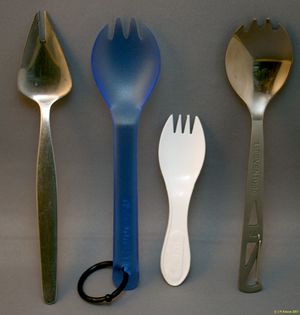 - Sporf – A utensil consisting of a spoon on one end, a fork on the other, and edge tines that are sharpened or serrated.