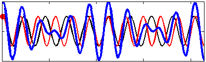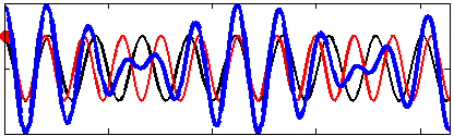 As far as seismic and acoustic waves are concerned, the motion of ocean waves in deep water is, to the leading order, equivalent to a pressure applied at the sea surface.[5] This pressure is nearly equal to the water density times the wave orbital velocity squared. Because of this square, it is not the amplitude of the individual wave trains that matter (red and black lines in the figures) but the amplitude of the sum, the wave groups (blue line in figures).