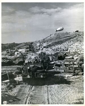 U.S. Marines and an M4 Sherman advancing toward an airfield on Cape Gloucester during the New Guinea campaign