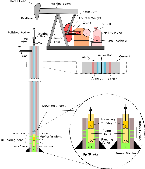 A schematic of a typical oil well being produced by a pumpjack, which is used to produce the remaining recoverable oil after natural pressure is no longer sufficient to raise oil to the surface.