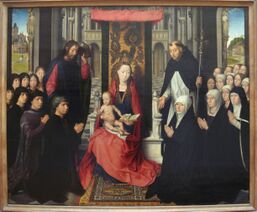 The main borders of the carpets in the Paele and Lucca Madonna, as well as in Virgin and Child with Saints however, each show a non-Oriental undulating trefoil stem.[63] Similar ornaments can be found in the borders of many carpets in Early Netherlandish paintings from the 15th to the beginning of the 16th century.[63] The fringes of these carpets are often found at the sides of the painted carpets, not at the upper and lower ends. Either did the carpets have an uncommonly square shape, or maybe the artists have used some license and improvised with the authentic models. Alternatively, the carpets depicted by van Eyck and Petrus Christus could be of Western European manufacture. The undulating trefoil design is a well-known feature of Western Gothic ornament.[63]