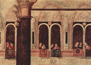 Although the carpets were displayed on a public floor in a few examples, most carpets on the floor are in an area reserved for the main protagonists, very often on a dais or in front of an altar, or down steps in front of the Virgin Mary or saints, or rulers,[22] in the manner of a modern red carpet. This presumably reflected the contemporary practice of royalty; in Denmark the 16th century Persian Coronation Carpet is used under the throne for coronations to this day. They are also often hung over balustrades or out of windows for festive occasions, such as the processions through Venice shown by Vittore Carpaccio or Gentile Bellini (see gallery);[23] when Carpaccio's St Ursula embarks they are hung over the sides of boats and footbridges.[24]