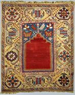 Some of the prayer carpets represented in Christian religious paintings are Islamic prayer rugs, with such motifs as the mihrab or the Kaaba (the so-called re-entrant carpets, later called the "Bellini" type).[30] The representation of such prayer rugs disappeared after 1555, probably as a consequence of the realization of their religious meaning and connection to Islam.[31]