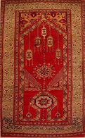 Right image: Prayer rug, Anatolia, late 15th to early 16th century, with "re-entrant" keyhole motif.