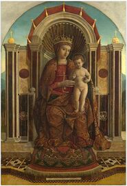 Oriental carpets were often depicted as a decorative element in religious scenes, and were a symbol of luxury, status and taste,[25] although they were becoming more widely available throughout the period, which is reflected in the paintings. In some cases, such as paintings by Gentile Bellini, the carpets reflect an early Orientalist interest, but for most painters they merely reflect the prestige of the carpets in Europe. A typical example is the Turkish carpet at the feet of the Virgin Mary in the 1456–1459 San Zeno Altarpiece by Andrea Mantegna (see detail).[26]
