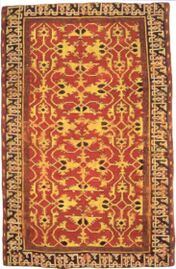 Though they look very different from Holbein Type I carpets, they are a development of the type, where the edges of the motifs, nearly always in yellow on a red ground, take off in rigid arabesques somewhat suggesting foliage, and terminating in branched palmettes. The type was common and long-lasting, and is also known as "Arabesque Ushak".[51]