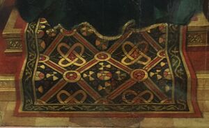 One of the first uses of an Oriental carpet in a European painting is Simone Martini's Saint Louis of Toulouse Crowning Robert of Anjou, King of Naples, painted in 1316–1319.[15] Another Anatolian animal carpet appears in a c. 1340–45 Sienese panel of the Holy Family attributed to Pietro or Ambrogio Lorenzetti (Abegg-Stiftung, Riggisberg) with alternating black and white animals within colorful octagonal medallions.[16] European depictions of Oriental carpets were extremely faithful to the originals, judging by comparison with the few surviving examples of actual rugs of contemporary date. Their larger scale also allows more detailed and accurate depictions than those shown in miniature paintings from Turkey or Persia.