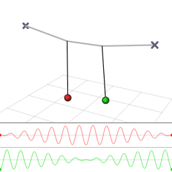 Depending on the starting point of the masses, this system has 2 possible frequencies (or a combination of the two). If the masses are started with their displacements in the same direction, the frequency is that of a single mass system, because the middle spring is never extended. If the two masses are started in opposite directions, the second, faster frequency is the frequency of the system.[2]