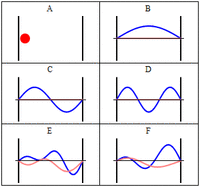 Some trajectories of a particle in a box according to Newton's laws of classical mechanics (A), and according to the Schrödinger equation of quantum mechanics (B–F). In (B–F), the horizontal axis is position, and the vertical axis is the real part (blue) and imaginary part (red) of the wavefunction. The states (B,C,D) are energy eigenstates, but (E,F) are not.