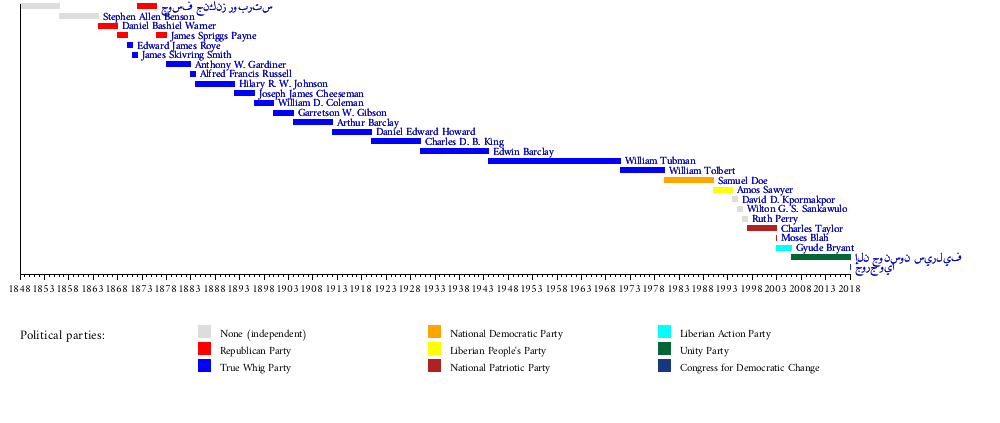 جورج وياإلن جونسون سيرليفGyude BryantMoses BlahCharles TaylorRuth PerryWilton G. S. SankawuloDavid D. KpormakporAmos SawyerSamuel DoeWilliam TolbertWilliam TubmanEdwin BarclayCharles D. B. KingDaniel Edward HowardArthur BarclayGarretson W. GibsonWilliam D. ColemanJoseph James CheesemanHilary R. W. JohnsonAlfred Francis RussellAnthony W. GardinerJames Skivring SmithEdward James RoyeJames Spriggs PayneDaniel Bashiel WarnerStephen Allen Bensonجوسف جنكنز روبرتس