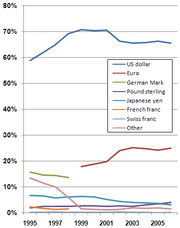 | المصادر: 1995-1999, 2006-2009 IMF صند: تشكيلة عملات احتياطيات النقد الأجنبي الرسمية Sources: 1999-2005 ECB: تراكم احتياطيات العملة الصعبة | |||||||||||||||