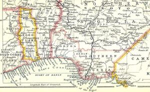 The Slave Coast is a historical region along the Atlantic coast of West Africa, encompassing parts of modern-day Togo, Benin, and Nigeria. It is located along the Bight of Biafra and the Bight of Benin that is located between the Volta River and the Lagos Lagoon.[1][2]