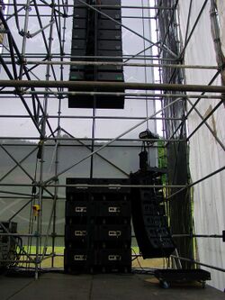 A large line array with separate subs and a smaller side fill line array.