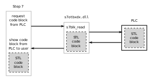 According to researcher Ralph Langner,[30][31] once installed on a Windows system Stuxnet infects project files belonging to Siemens' WinCC/PCS 7 SCADA control software[32] (Step 7), and subverts a key communication library of WinCC called s7otbxdx.dll. Doing so intercepts communications between the WinCC software running under Windows and the target Siemens PLC devices that the software is able to configure and program when the two are connected via a data cable. In this way, the malware is able to install itself on PLC devices unnoticed, and subsequently to mask its presence from WinCC if the control software attempts to read an infected block of memory from the PLC system.[33]