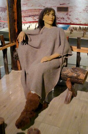 The Beauty of Loulan's hair colour has been described as auburn.[65] Her hair was infested with lice.[64] The Beauty of Loulan is wearing clothing made of wool and fur. Her hood is made of felt and has a feather in it.[69] She is wearing rough ankle-high moccasins made of leather, with fur on the outside. Her skirt is made of leather, with fur on the inside for warmth. She is also wearing a woolen cap. According to Elizabeth Barber, these provisions against the cold suggest she died during the winter.[65] The Beauty of Loulan possesses a comb, with four teeth remaining. Barber suggests that this comb was a dual purpose tool to comb hair and to "pack the weft in tightly during weaving." She possesses a "neatly woven bag or soft basket". Grains of wheat were discovered inside the bag.[65]
