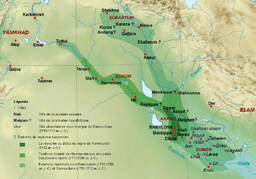 Map of the Ancient Near East showing the city-state Assur within the territory of the First Babylonian Dynasty during the reign of King Hammurabi's son and successor, Samsu-iluna (light green) c. 1654 BC.