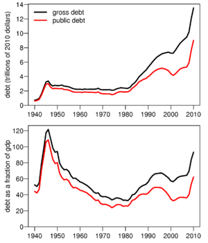 ارتفع صافي الدين العام حسب القيمة الاسمية للدولار ثم انخفض بين عامي 1992 و2000 من 3 تريليون في عام 1992 إلى 3.4 تريليون في عام 2000. أثناء ادارة الرئيس جورج دبليو بوش، ازداد اجمالي الدين العام من 5.7 تريليون في عام 2001 إلى 10.7 تريليون في ديسمبر 2008.[27] تحت رئاسة باراك اوباما، ازداد الدين من 10.7 تريليون إلى 14.2 تريليون دولار في فبراير 2011.[28]