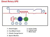 - مزود طاقة لامنقطعة دوار، الذي يتم تغذية الحمل المهم بواسطة مولدة كهربائية تدار بواسطة محرك كهربائي في الحالة الأعتيادية وفي حالة الطوارئ وإنقطاع التيار الكهربائي الأساسي للشبكة الكهربائية (التي تمد المحرك بالتيار ) يتم الإعاز إلى ماكنة ديزل المتصلة بالمنظومة بإشتغال وتدوير المولدة الكهربائية (عندإنقطاع التيار عن المحرك الكهربائي), وهذا النوع من المزودات يستخدم عادة للأحمال ذات السعات الكبيرة ولمايزيد عن 100 كي.في.أي .