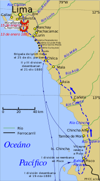 Landing and deployment of Chilean troops during the Campaign of Lima, from November 1880 to January 1881. The long way from Pisco to Chilca was done only by the Lynch brigade.
