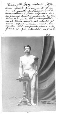 Photo of Chilean private first class Tránsito Diaz, injured during the Landing on Pisagua. The photo belongs to the "Álbum de inválidos de la Guerra del Pacífico", 130 photographic records ordered by the D. Santa María government to demonstrate the pensions and orthopedic devices given to disabled war veterans.[32] 4,081 Chilean soldiers returned disabled from the war, that is 10% of the expeditionary force. In 2008, 280 women were receiving a pension as the daughter or wife of a veteran.[33]:20;30