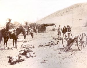 Martiniano Urriola (with kepi), who in 1883 commanded the occupation of Ayacucho, and Marcos Maturana (with poncho), General staff chief of the Expeditionary Army during the Lima Campaign, viewed the dead bodies of a Peruvian gun crew after the Battle of Chorrillos.