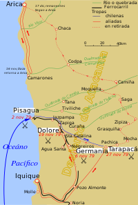 After the battle of Angamos and once Chile achieved naval supremacy, the government had to decide where to strike. The options were Tarapacá, Moquegua or directly Lima. Because of the proximity to Chile and the capture of the Peruvian Salitreras, Chile decided to occupy first the Peruvian Province of Tarapacá.
