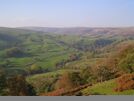 The highest mountains in Yorkshire all lie in the Pennines on the western side of the county, with millstone grit and limestone forming the underlying geology and producing distinctive layered hills. The county top is the remote Mickle Fell[75] (height 788 متر (2،585 ft) above sea level) in the North Pennines southwest of Teesdale, which is also the highest point in the North Riding. The highest point in the West Riding is Whernside (height 736 متر (2،415 ft)) near to Ingleton in the Yorkshire Dales. Together with nearby Ingleborough (height 723 متر (2،372 ft)) and Pen-y-Ghent (height 694 متر (2،277 ft)), Whernside forms a trio of very prominent and popular summits (the Yorkshire Three Peaks) which can be climbed in a challenging single day's walk. The highest point in the Yorkshire part of the Peak District is Black Hill (height 582 متر (1،909 ft)) on the border with historic Cheshire (which also forms the historic county top of that county). The hill ranges along the eastern side of Yorkshire are lower than those of the west. The highest point of the North York Moors is Urra Moor (height 454 متر (1،490 ft)). The highest point of the Yorkshire Wolds, a range of low chalk downlands east of York, is Bishop Wilton Wold (height 246 متر (807 ft)), which is also the highest point of the East Riding. The view from Sutton Bank at the southeastern edge of the North York Moors near Thirsk encompasses a vast expanse of the Yorkshire lowlands with the Pennines forming a backdrop. It was called the "finest view in England" by local author and veterinary surgeon James Herriot in his 1979 guidebook James Herriot's Yorkshire.[76]